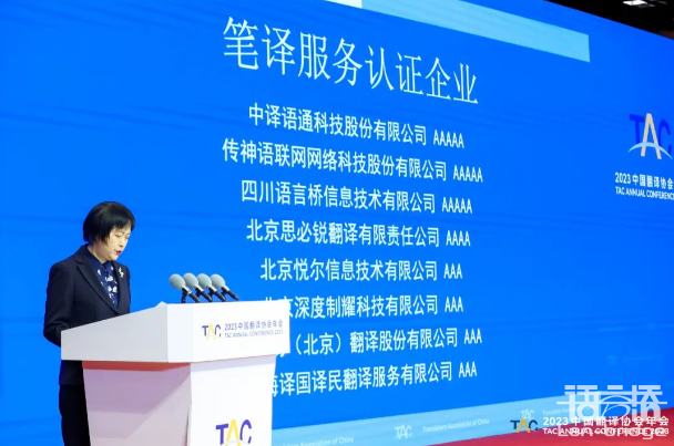 2023年4月3日,由中國外文局指導(dǎo),中國翻譯協(xié)會主辦“2023中國翻譯協(xié)會年會”在北京國際會議中心開幕。會議期間發(fā)布了《2023中國翻譯及語言服務(wù)行業(yè)發(fā)展報告》《2023全球翻譯及語言服務(wù)行業(yè)發(fā)展報告》,并進行了翻譯服務(wù)認(rèn)證企業(yè)授牌暨《口譯服務(wù)認(rèn)證要求》發(fā)布。