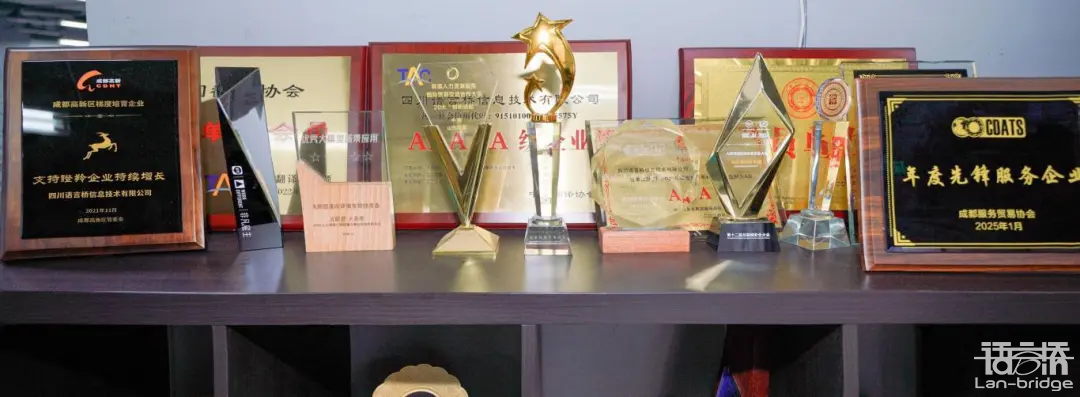 歷經25年,語言橋獲得過多種獎項和榮譽,如中國十佳翻譯服務企業(yè)、中國翻譯服務行業(yè)5A級筆譯+口譯認證企業(yè)、國家語言服務出口基地、國家高新技術企業(yè)、四川省技術中心等。同時,語言橋也獲得了多項國際標準化組織的認證,如 ISO 9001質量管理體系認證、ISO 27001信息安全管理體系認證、ISO 45001職業(yè)健康安全管理體系認證等。