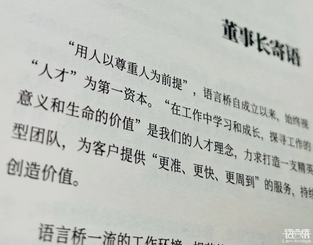 我還記得2005年語言橋第一本《企業(yè)文化手冊》中的第一句話,“用人以尊重人為前提”的人才理念。語言橋自成立以來,始終視“人才”為第一資本,打造“簡單、真誠、友誼”的企業(yè)文化。提倡在工作中學習和成長,探尋工作的意義和生命的價值。正是這些經營理念和價值觀,為語言橋的發(fā)展注入了源源不斷的動力和能量。加上語言橋職業(yè)化的管理團隊,積極向上的工作氛圍,孜孜不倦地學習和創(chuàng)新精神,才成就了語言橋的今天。當前,我對于語言橋的現(xiàn)有團隊更有信心,期待公司下一步在技術化轉型、國際化拓展、多品牌戰(zhàn)略的征途中,取得更好的成績。