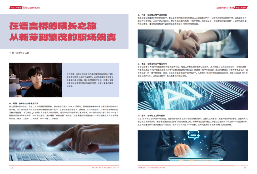 這是他來到翻譯中心的第一年,他說:”譯者的角色在從語言搬運工向技術(shù)使用者演進,對AI技術(shù)的思考不斷拓展著我的職業(yè)視野,期待與公司共赴下一個春秋,在時代浪潮中手寫屬于我們的語言傳奇。“