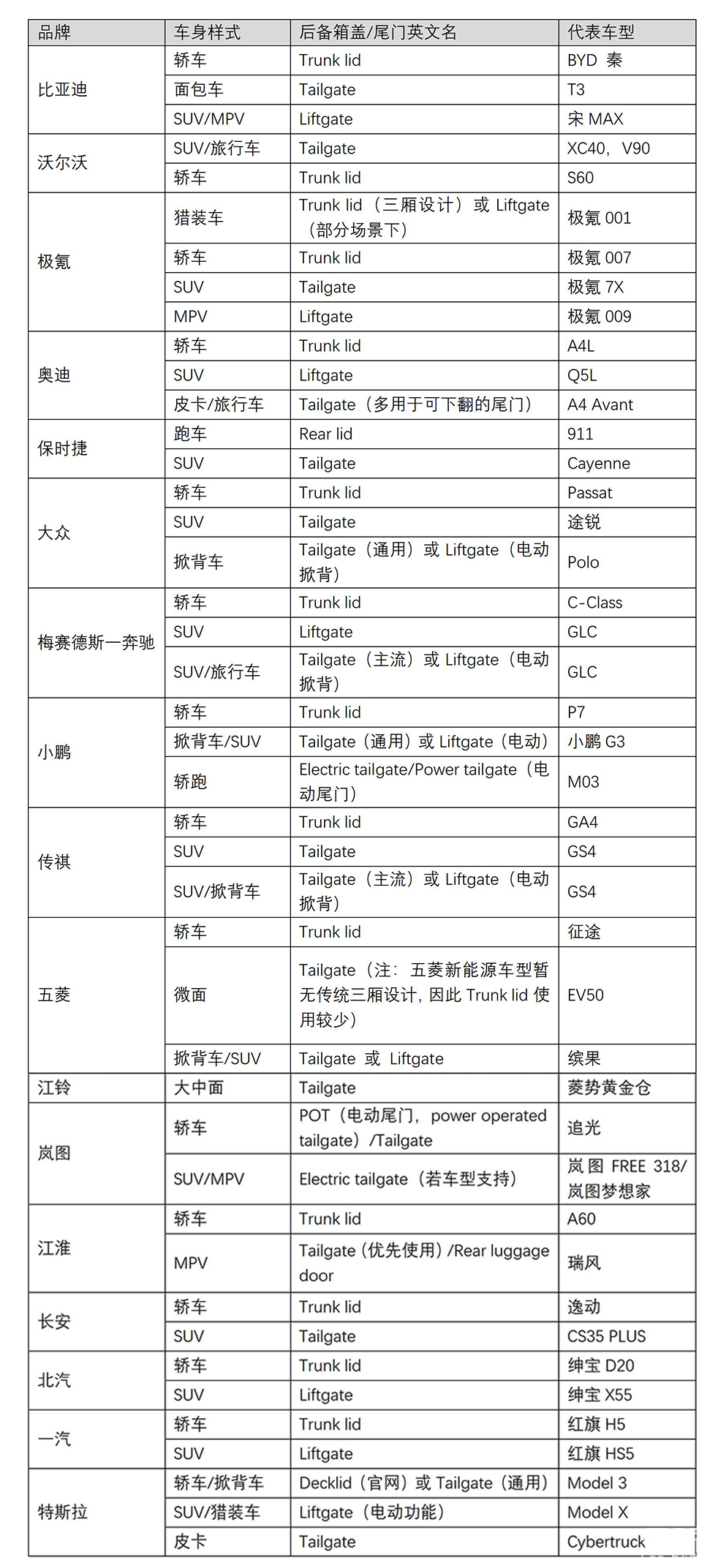 盡管筆者搜集了大量信息以確保本文的準確性,但由于不同車輛的獨特性以及車企自身的命名選擇,市場上各類車輛的后備箱蓋和尾門的英文名稱并不統一。因此,具體名稱取決于車企及車輛的款式和型號。下表為部分車企的后備箱蓋和尾門英文名稱,可供參考(信息可能會更新):