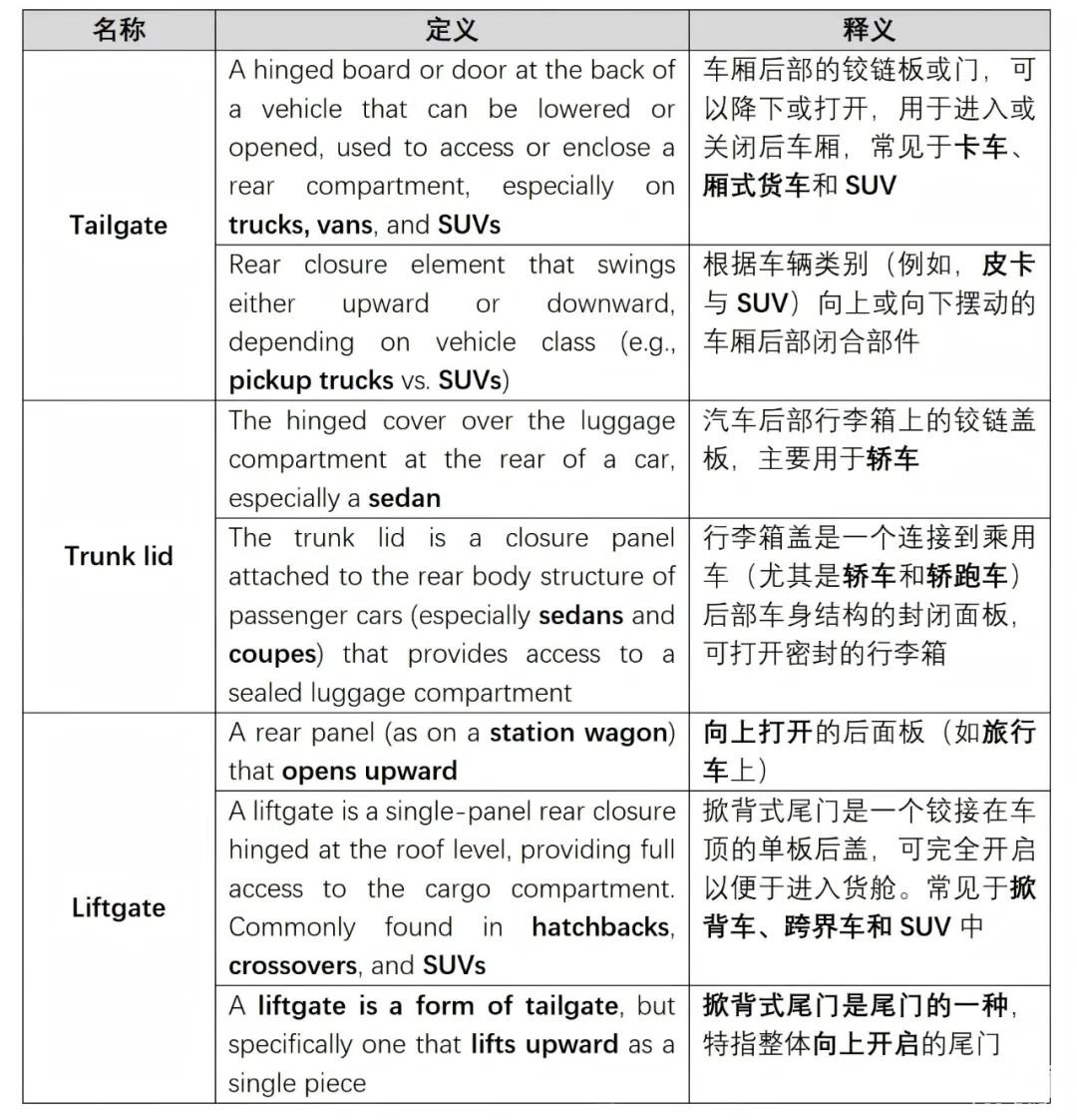 某日,某大型車企客戶咨詢了“tailgate”與“liftgate”的區別,并就其某款車型應選用哪個術語征求了我們的建議。筆者總結如下: