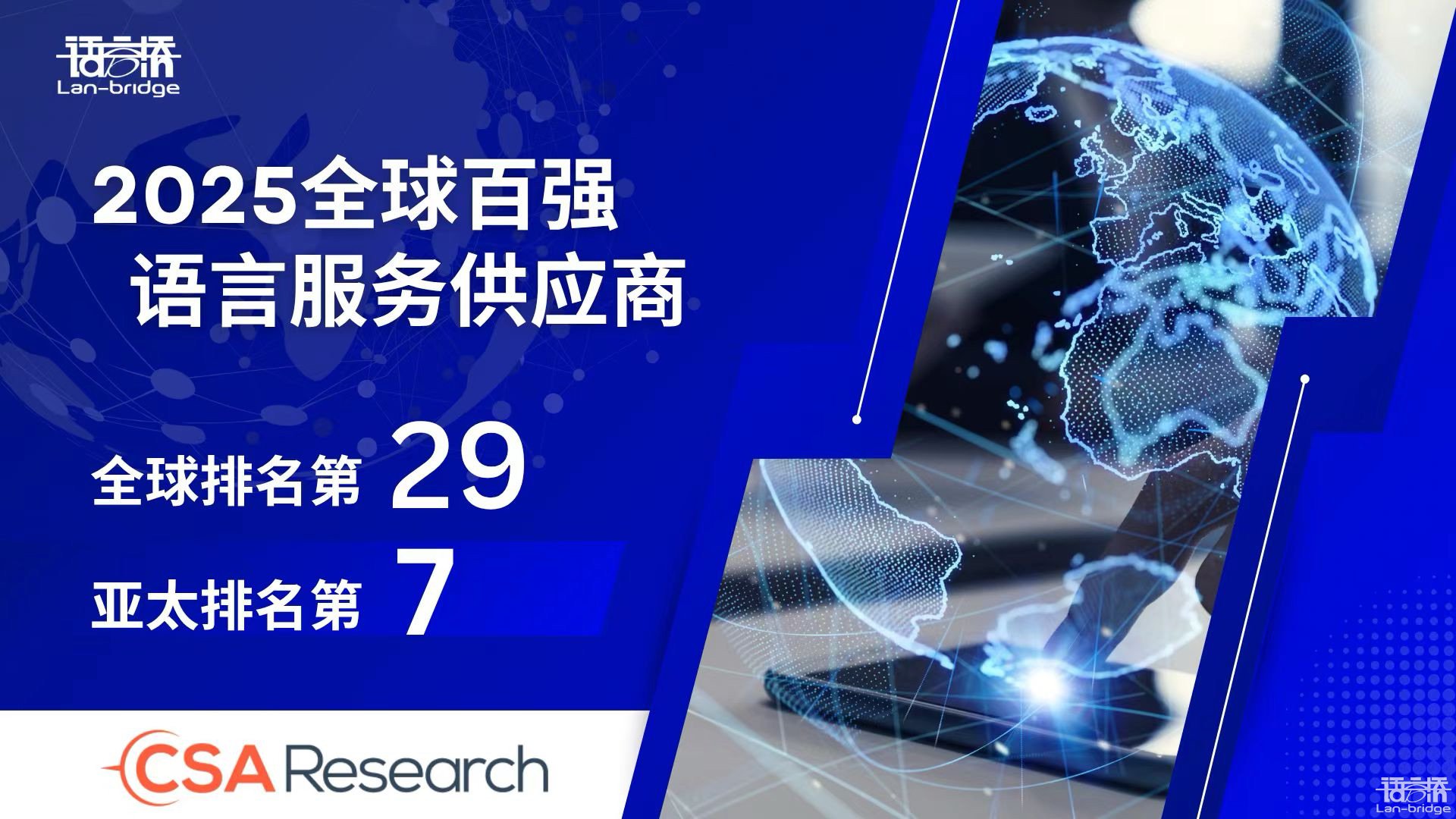 恰逢語言橋成立25年,喜報再次傳來,當(dāng)CSA Research 2025全球百強(qiáng)語言服務(wù)供應(yīng)商榜單揭曉的那一刻,一個令人振奮的消息傳來:語言橋集團(tuán)全球排名再次提升了8個位次,躍升至第29名;亞太地區(qū)排名提升2個位次,位居第7名。